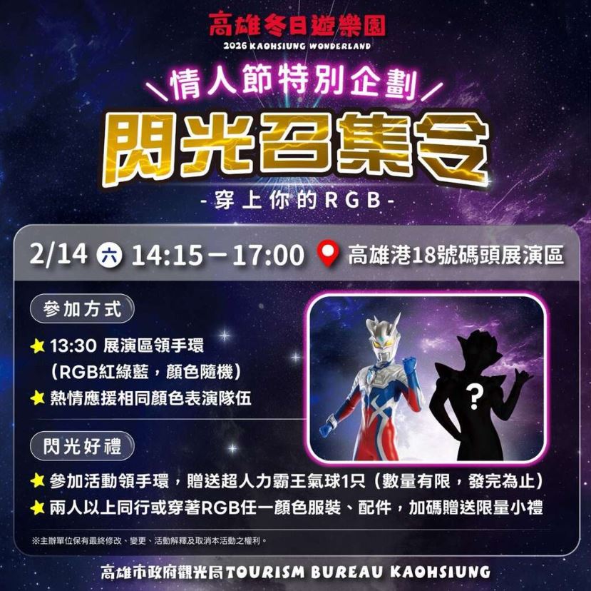 今日(2月14日)西洋情人節,冬日遊樂園推出「閃光召集令」快閃活動,包含現場表演與限量氣球發送,下午1點30分開始發放活動手環與超人力霸王氣球,穿著RGB紅綠藍元素服裝或配件者,還可獲得限定小禮物。