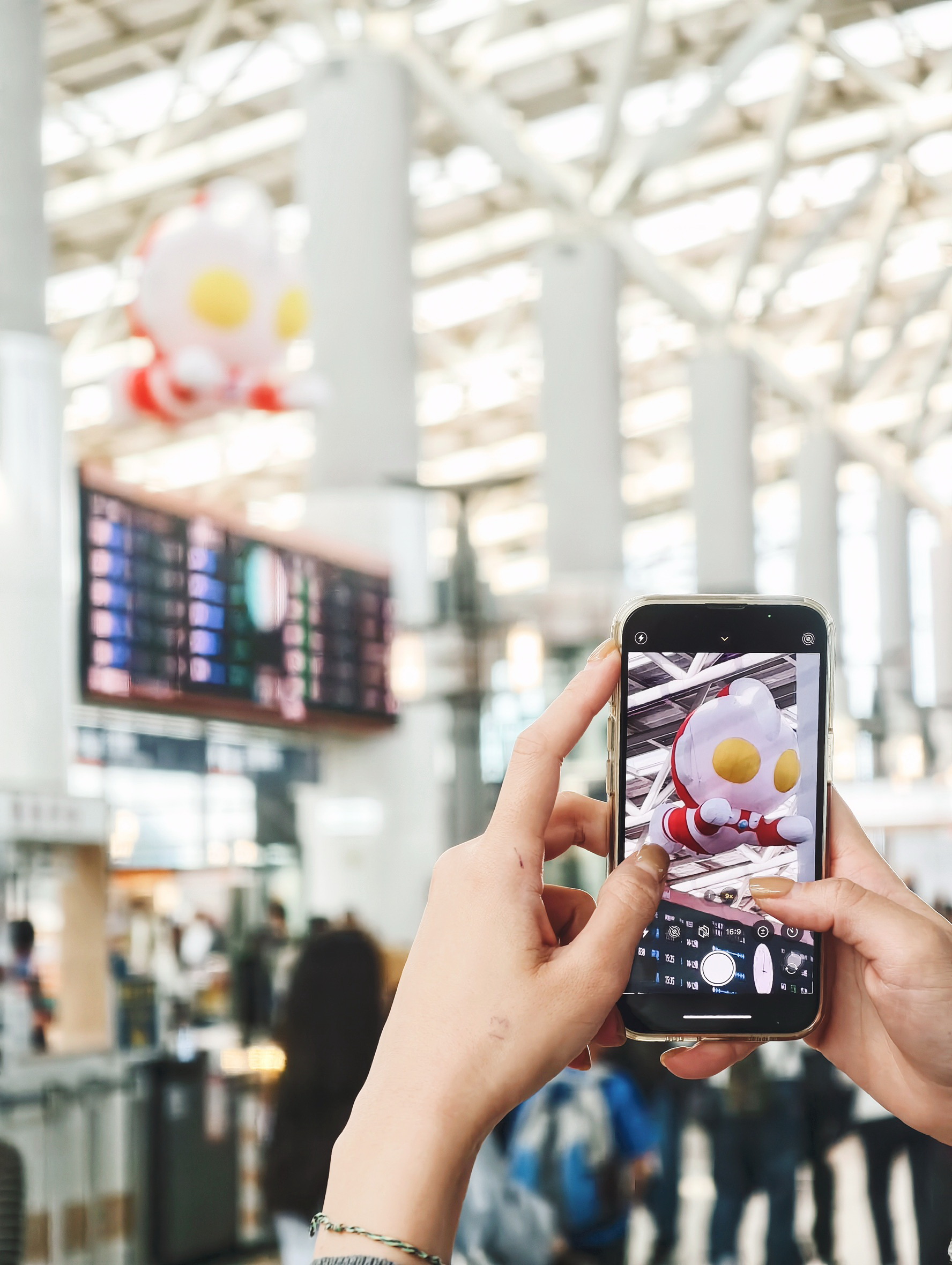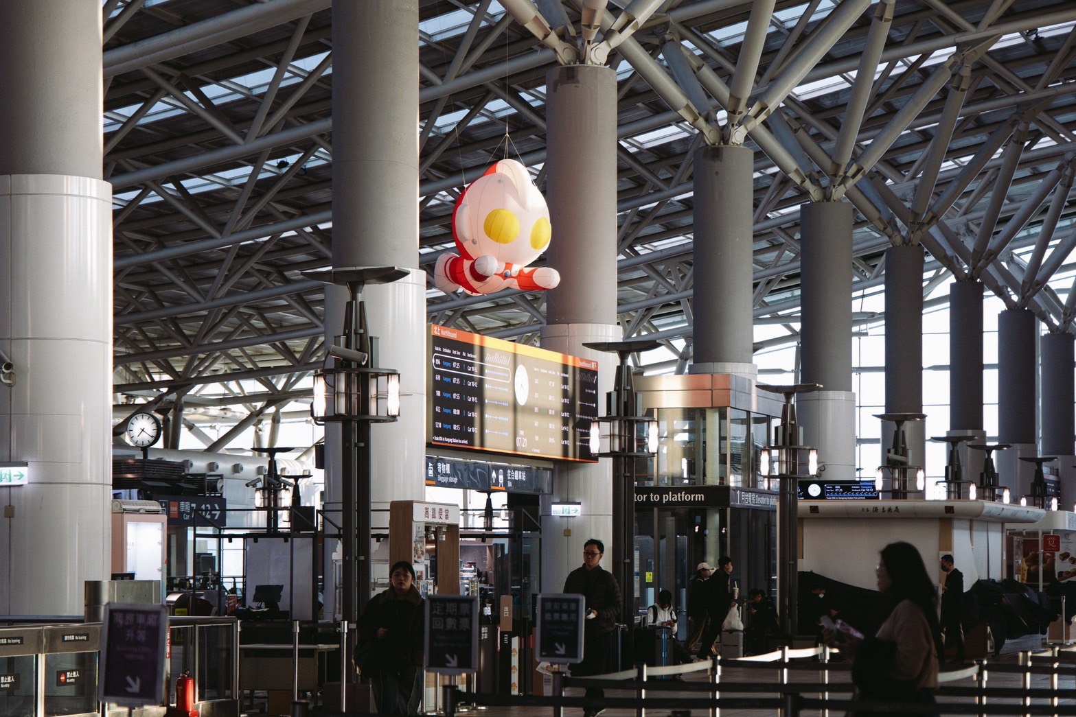 於高鐵左營站大廳的列車時刻表上方展示超人力霸王Q版氣膜裝置。