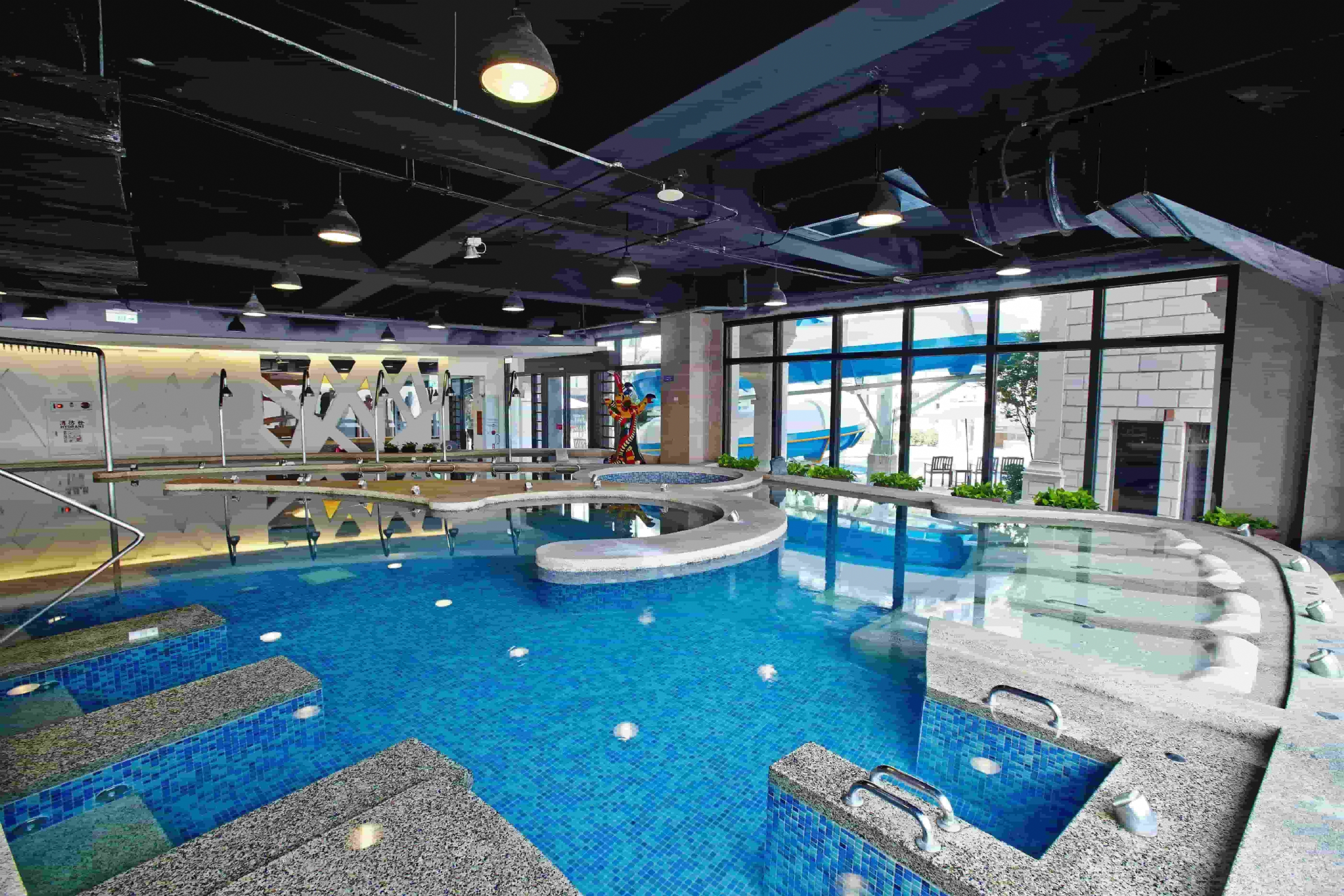 館內設有豐富的休閒設施,無論是涼爽的戶外戲水池,或是放鬆的室內水療池、三溫暖、兒童遊戲室及健身房等。
