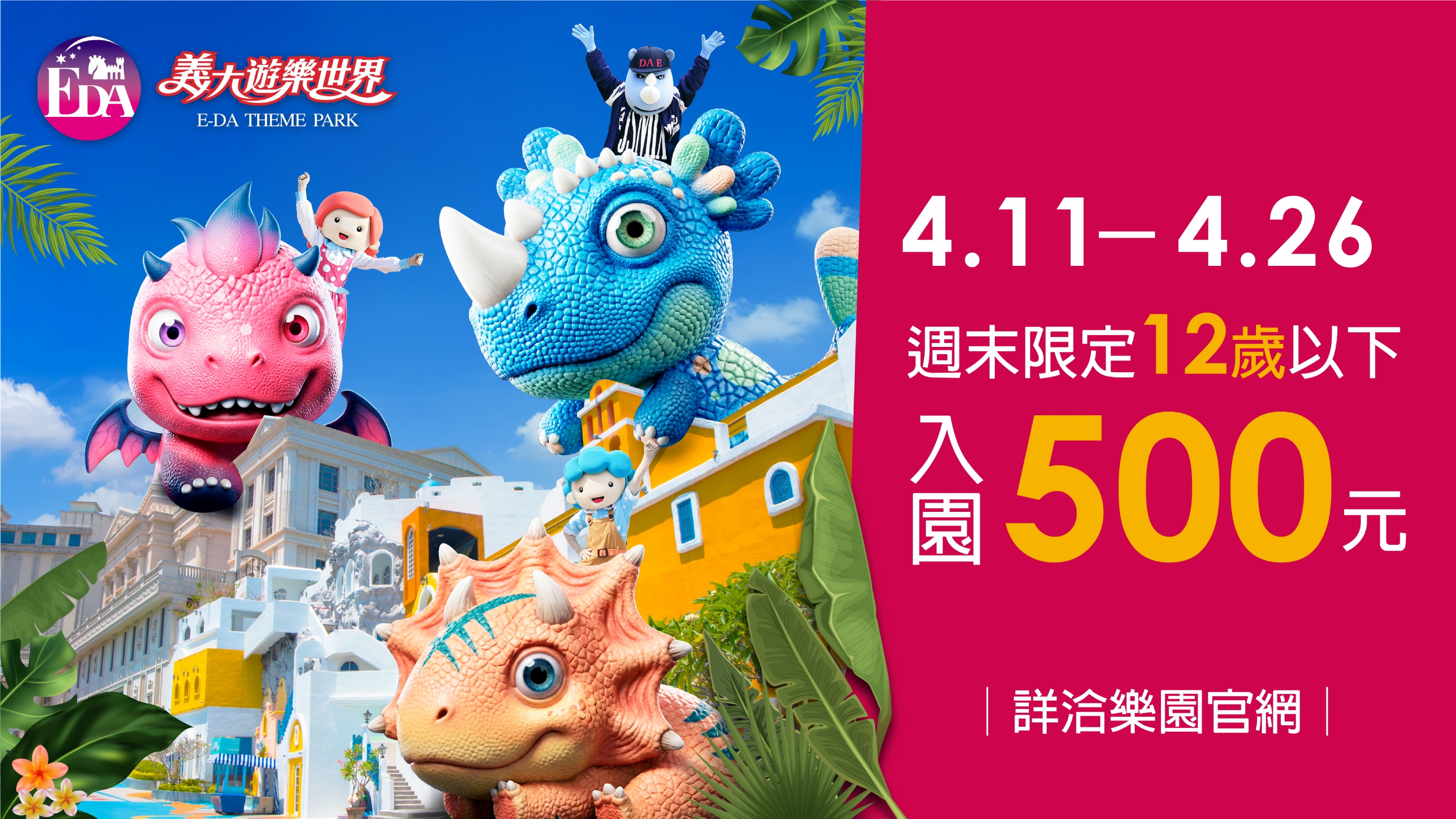 於指定週六、日(4/11、12、18、19、25、26),12歲以下學童只要500元即可入園(需由成人陪同購票入園)。