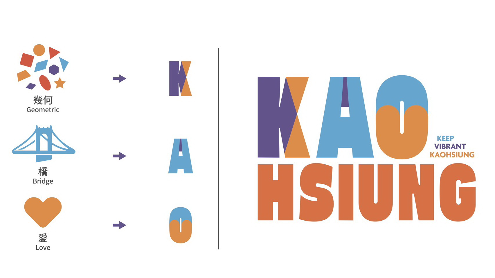 在英文字體的設計上,則融入高雄經典地標地景,以橋梁與愛心等意象。
