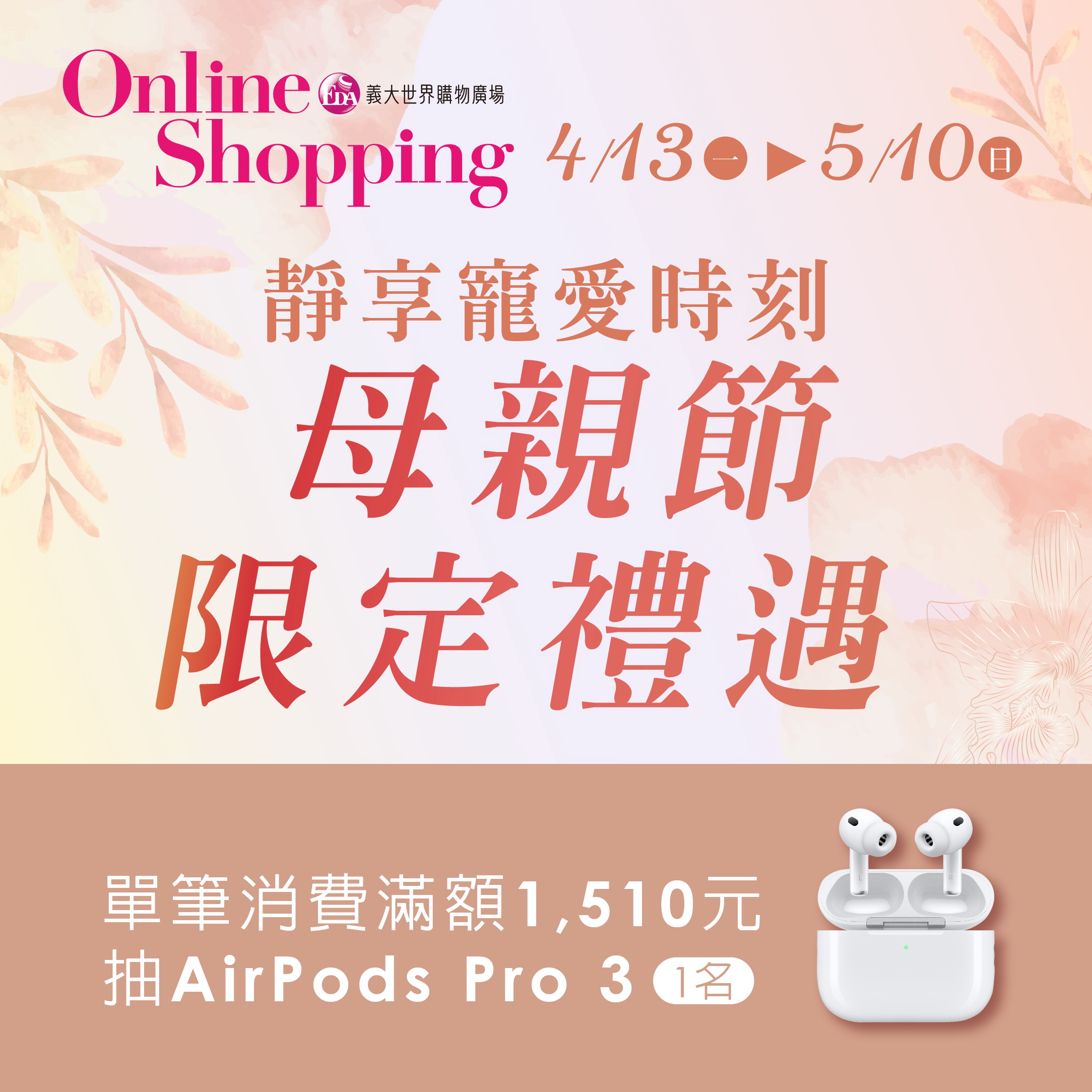 義大電子商城推出母親節寵愛加碼活動,活動期間單筆消費滿1,510元,即有機會抽中AirPods Pro 3。