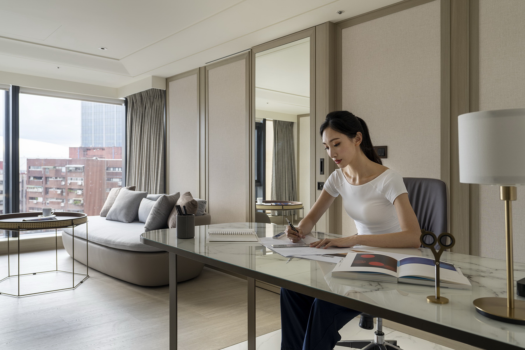 ( 瀚寓酒店每間房內都配置大桌面大理石工作桌,讓住客就像在家中書房內寫意辦公 圖/瀚寓酒店提供 )