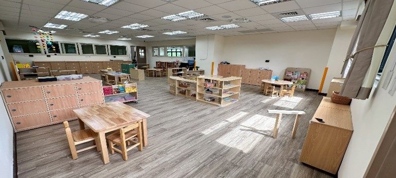 教室空間顯得明亮舒適,孩子能在光影交織的世界中閱讀、遊戲與探索。