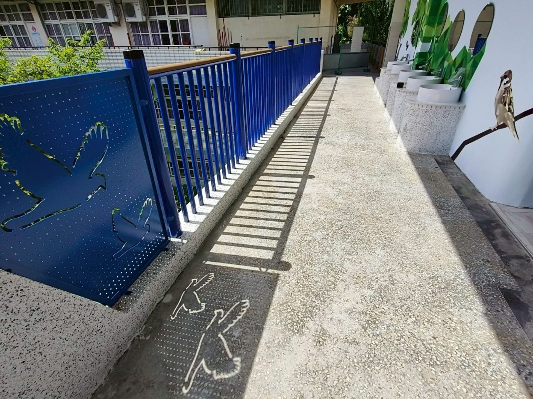 設計融入鳥類意象的鏤空圖案,與校園彩繪相互呼應,讓走道成為孩子眼中的小風景。