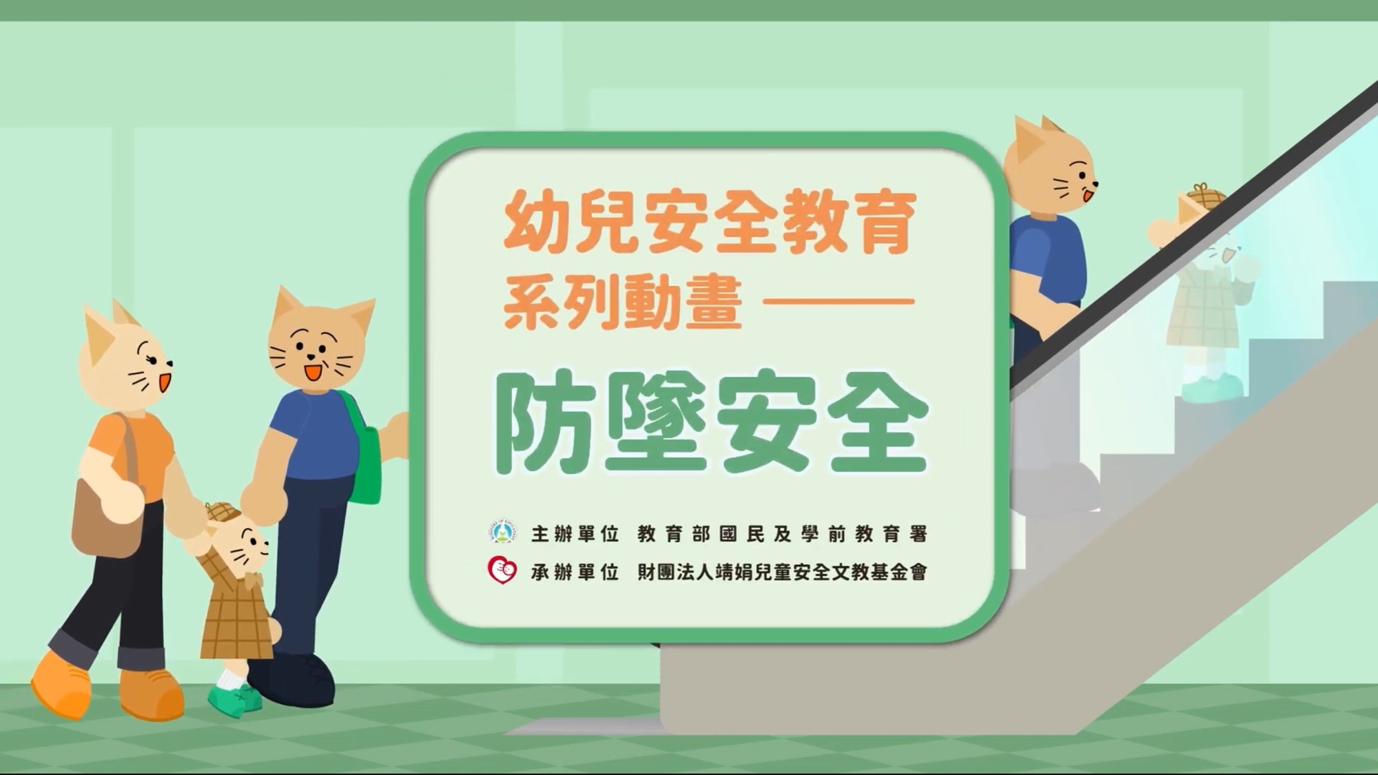 防墜主題則透過動畫情境帶入孩子可能遇到的環境,例如家中窗邊、陽台、樓梯、遊具高處、戶外高低落差等。