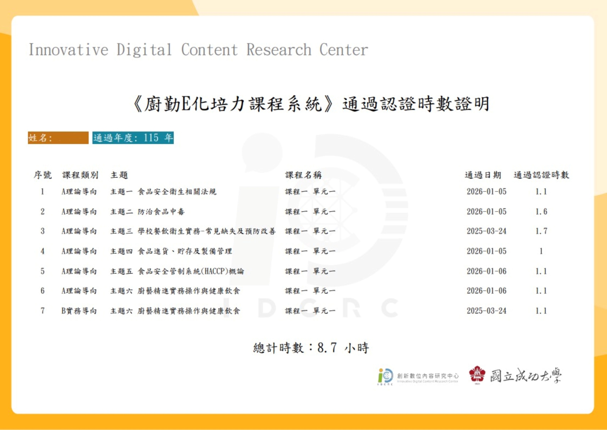 廚勤人員只要完成課程並通過學習要求,即可取得具官方認證效力的研習時數,讓進修更加便利且具制度保障。