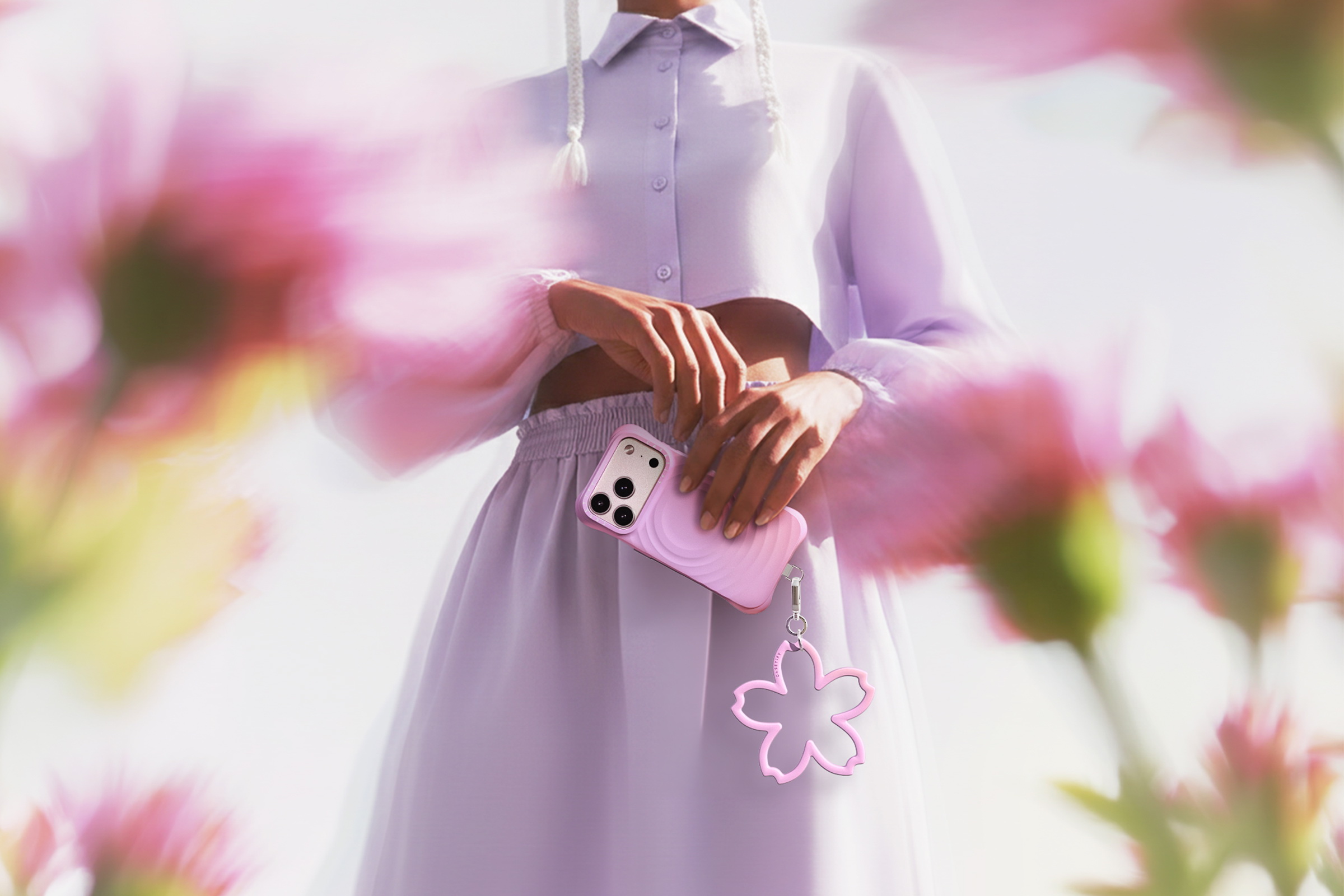 全新 Essentials by CASETiFY™ 系列「花朵手機吊飾」結合銀色花朵裝飾、充滿春天粉色氣息的可愛串珠。