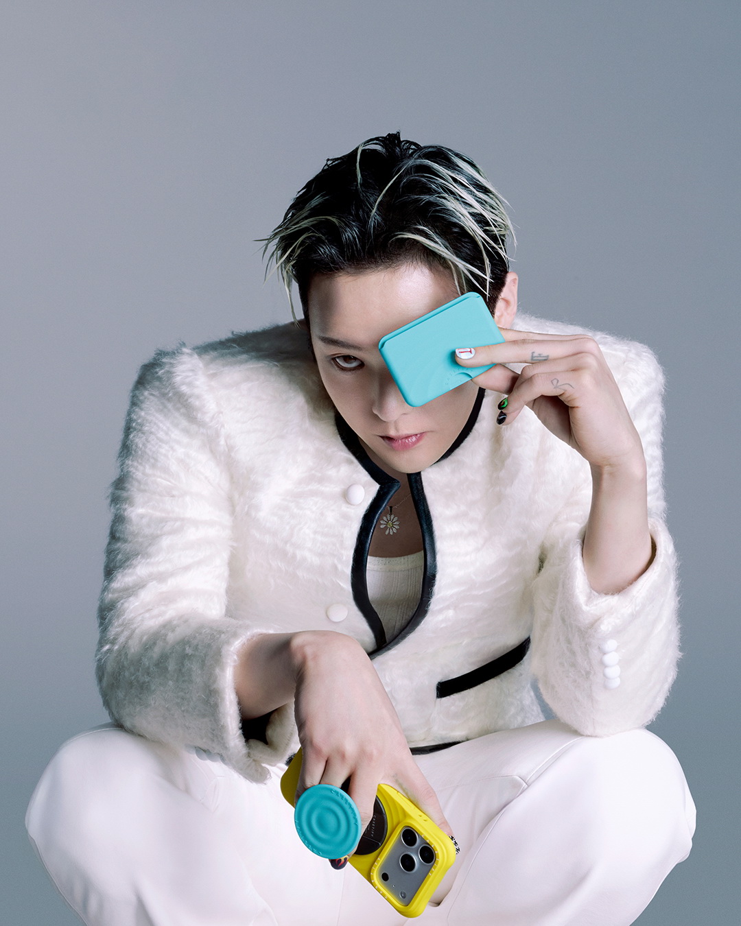 ( G-DRAGON 透過波紋手機殼與磁吸配件的撞色搭配,混搭出更具 G-DRAGON 個人魅力的造型風格 圖/品牌提供 )