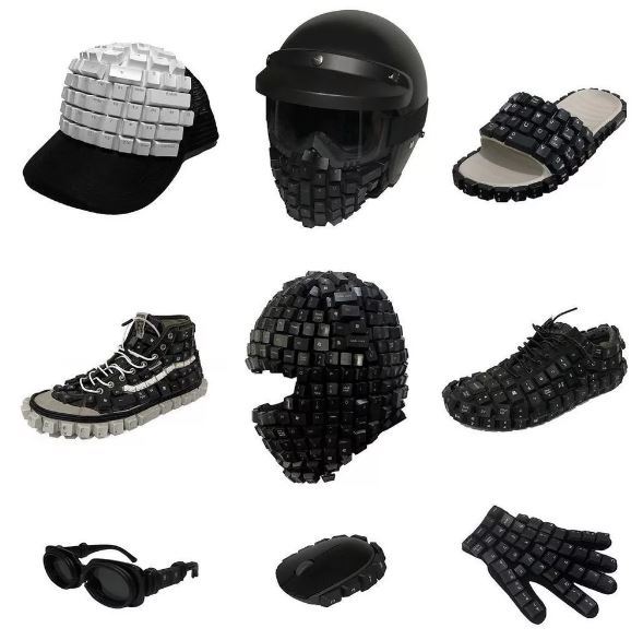 來自印尼的26歲藝術家Alfaz Syam成功地將科技廢料轉化為時尚單品,創造出一種獨特的「科技宅」風格。他專門收集廢棄鍵盤,將它們重新裁切、清理並轉化成各種可穿戴的時尚配件,如手套、拖鞋、太陽眼鏡、背心甚至胸罩等。這些由鍵盤製成的時尚配件不僅展現了再生藝術的魅力,同時也彰顯了手工藝品的獨特價值。