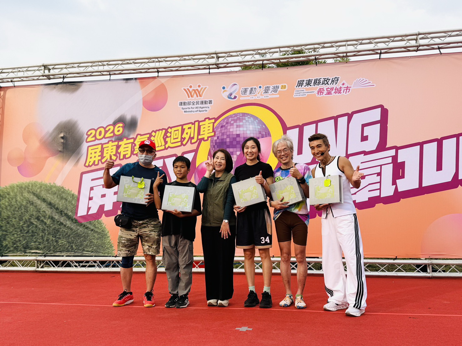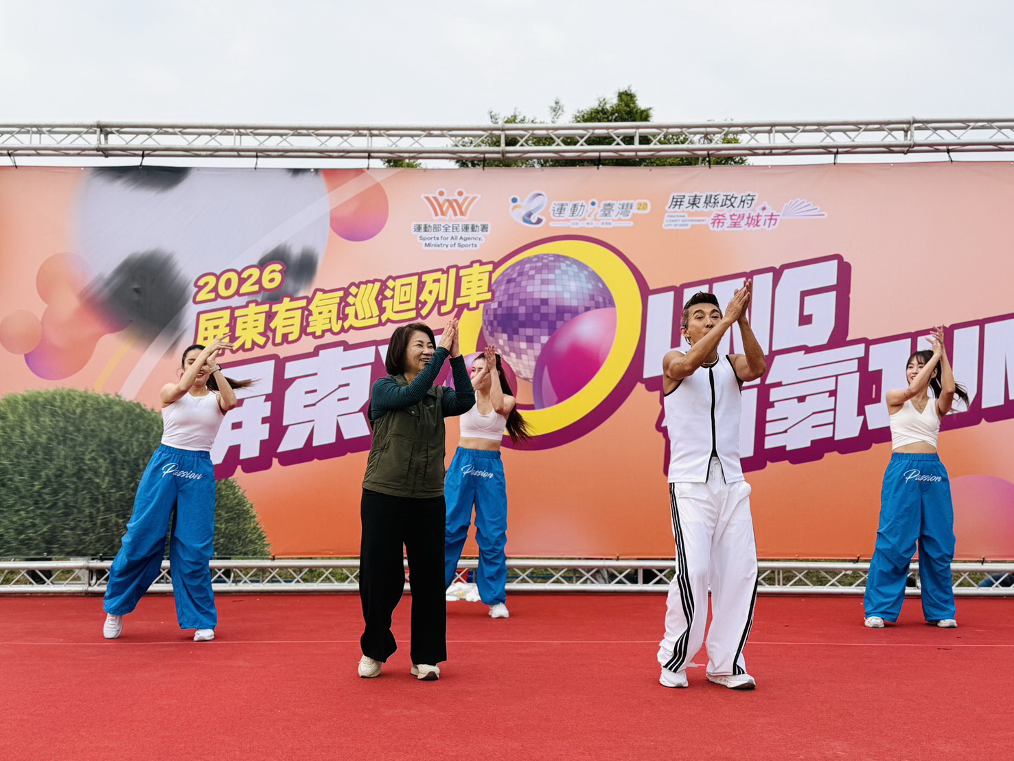 縣長周春米也到場與鄉親同樂,在有氧天王潘若迪帶領下跟著音樂熱情舞動,一起揮灑汗水,展現屏東全民運動的健康風氣。