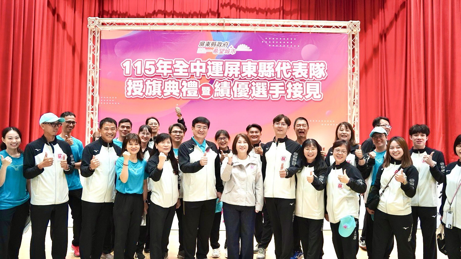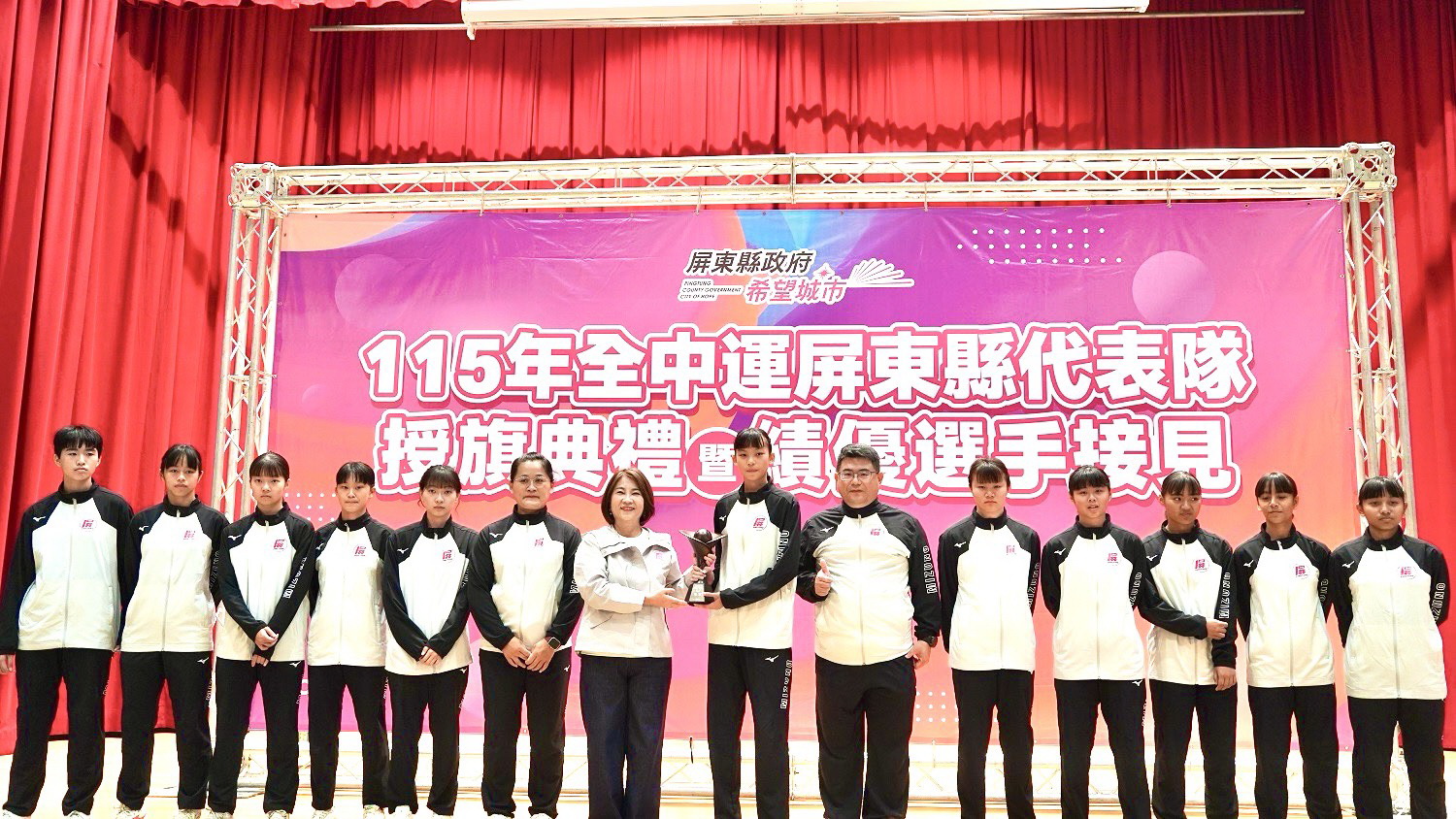 縣長周春米親自授旗,勉勵代表隊選手在賽場上無懼挑戰、發揮實力,為屏東再創榮耀。