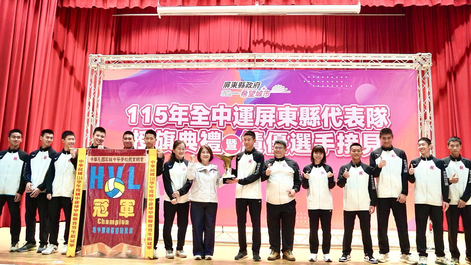 授旗典禮中,縣長周春米也特別接見並表揚績優選手,新園國中男、女排球隊及東港高中(國中部)男子足球隊,分別在各項全國賽事中勇奪佳績,展現屏東體育深厚實力。